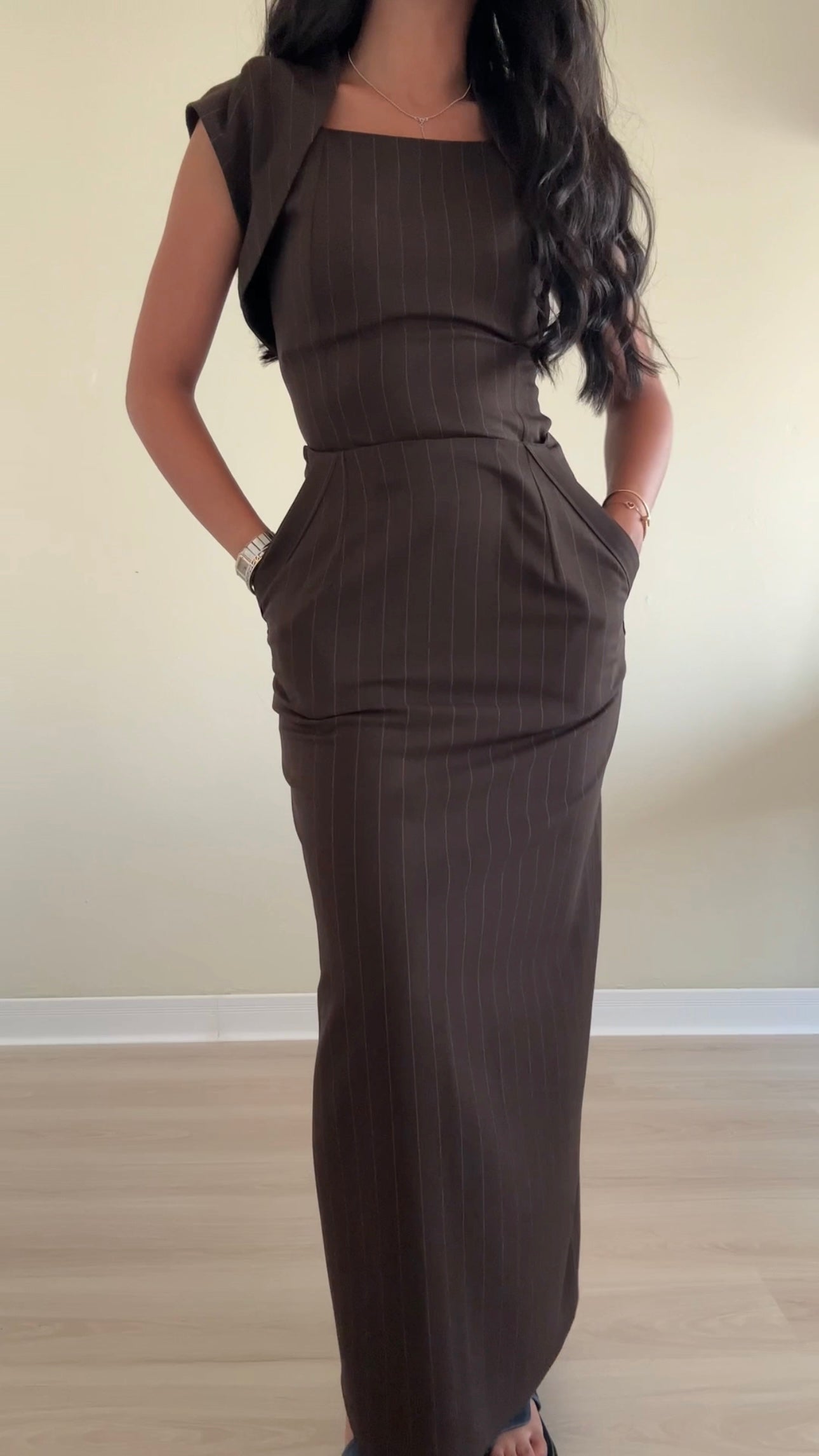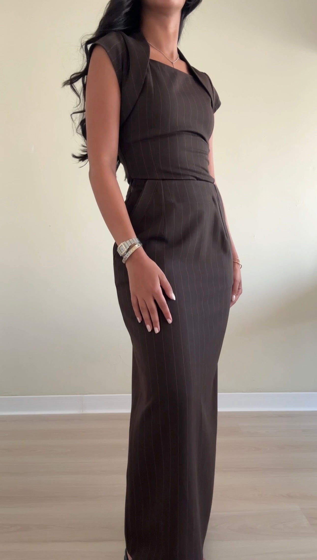 Meet Stria☕️✨ - a structured two-piece set in deep mocha with soft rose-pink pinstripes.Featuring a sculpted cap-sleeve top and midi skirt that hugs and defines.